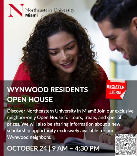 This Open House is the perfect chance to get a taste of life at Northeastern University in Miami. Throughout the day, we’ll have exciting raffle prizes and giveaways, delicious food, and share information about a new scholarship opportunity exclusively available for our Wynwood neighbors.